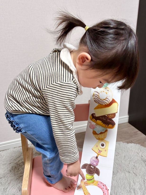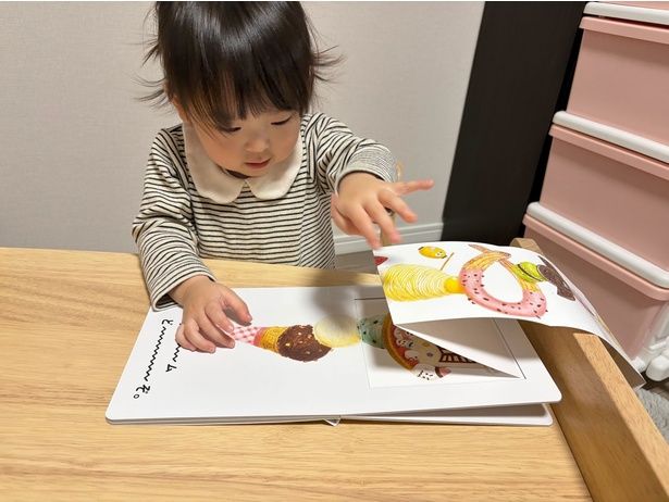 ひとしきり蛇腹のしかけを楽しんだ後、「ママ、これ」と絵を指さす娘。指さしたのは“マカロン”でした。実は“マカロン”、娘がおままごとでよく遊んでいたアイテム。知っている食べ物を見つけることができてうれしそうな表情を浮かべます。「おいしそうだね」と声をかけると、手を伸ばし「あむ、おいち」とおままごとのような遊び方をはじめました。