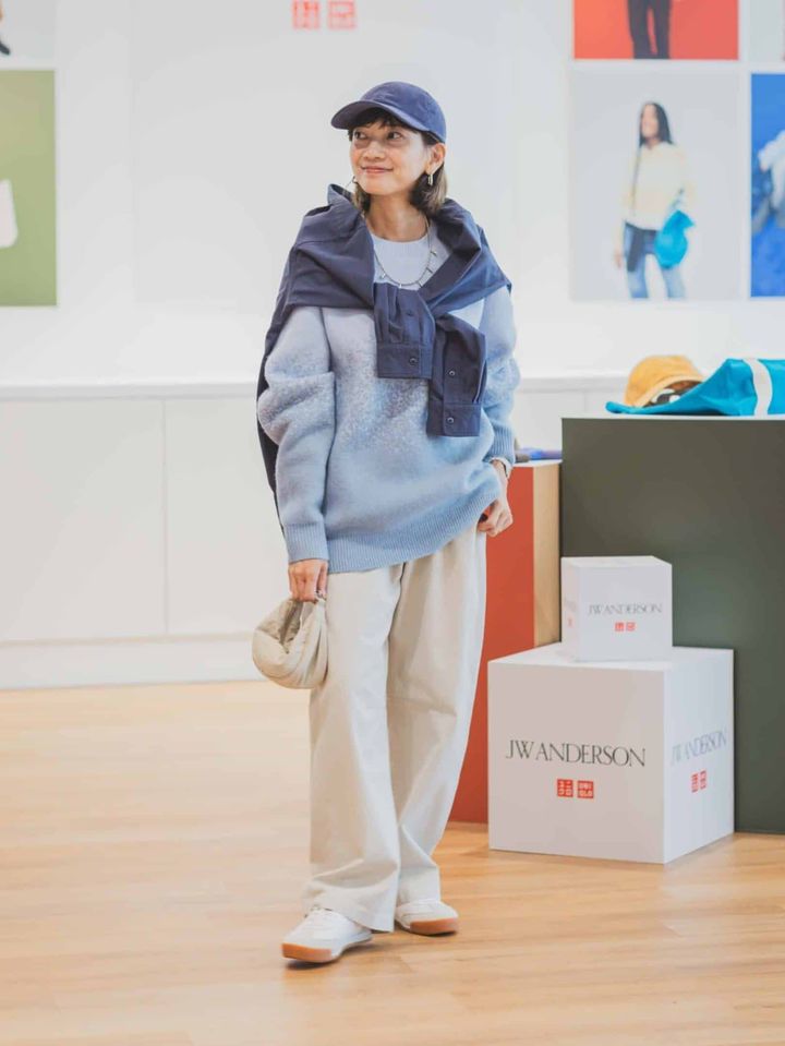 スフレヤーングラデーションセーター¥3,990 カーブパンツ¥4.990コーデュロイキャップ¥1,990(ユニクロ アンド ジェイ ダブリュー アンダーソン/ユニクロ)※セーターはLサイズ、その他すべてMサイズ着用 スウェードコンビネーションスニーカー¥4,990 ラウンドウルトラミニバッグ¥1,290(ユニクロ/ユニクロ)