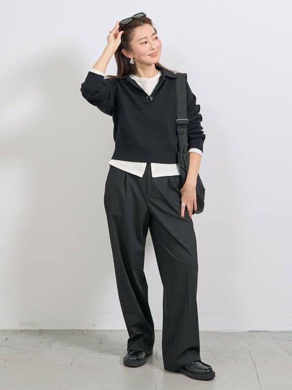 スムースコットンポロセーター¥3,990 ポインテール カーディガン¥1,990 タックワイドパンツ¥3,990 パフィーショルダーバッグ¥2,990 サングラス/レクタングル¥2,490(すべてユニクロ/ユニクロ)※セーターはSサイズ、カットソーとパンツはMサイズを着用 靴(私物)