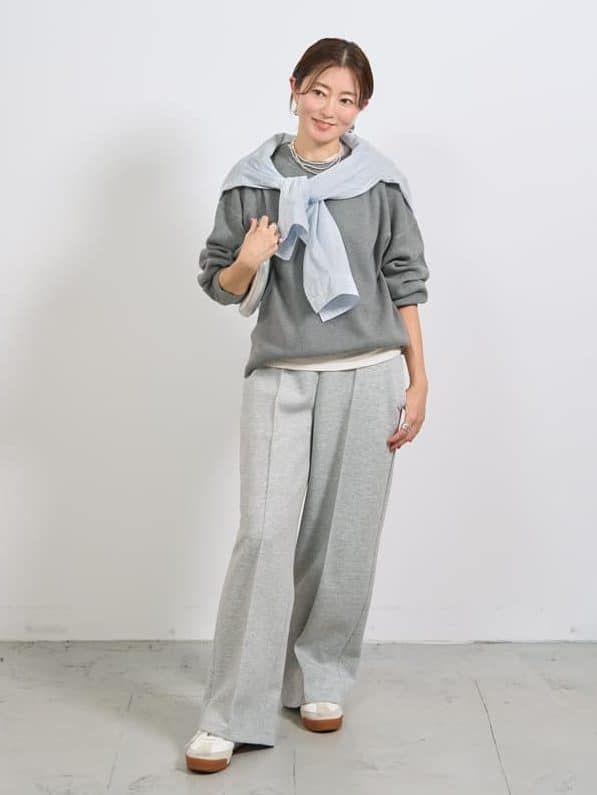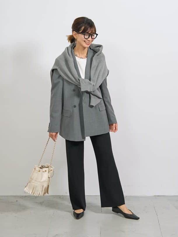 きちんと感と今っぽさを両立してくれる、ユニクロのダブルジャケット。程よくゆとりのあるジャケットは、羽織るだけで体のラインをきれいに整え、40代のデイリーコーデに頼もしさをプラスします。落ち感のある黒のニットパンツを合わせれば、リラックス感がありながらも品のあるバランスに。グレー×黒の配色でまとめることで、高見えと着回し力を両立した大人の万能スタイルが完成します。