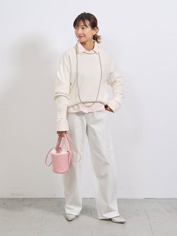 スムースコットンクルーネックセーター¥3,990 スウェットストレートパンツ¥3,990(ともにユニクロ : シー/ユニクロ) コットンオーバーサイズシャツ¥3,990 クルーネックT¥1,500 靴(参考商品)(すべてユニクロ/ユニクロ)※ニットはL、パンツ、Tシャツ、シャツはMサイズを着用 バッグ(私物)