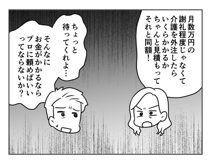 これから介護にかかるお金を考えれば、「プロに頼むとお金がかかるし、誰かに無償で介護をやってもらいたい」とも思いますよね。リツコさんもそのひとり。もしかしたらトモキさんもそのような考えに近かったのかもしれませんね。しかし言われた側のアサカさんとしては、そんな考え黙って「はい、わかりました」とは受け入れられない話。納得がいかないながらも解決しないといけないのであれば、せめてお金くらいは出してもらわないと了承できませんよね。アサカさん、その主張は当然のことですよ!