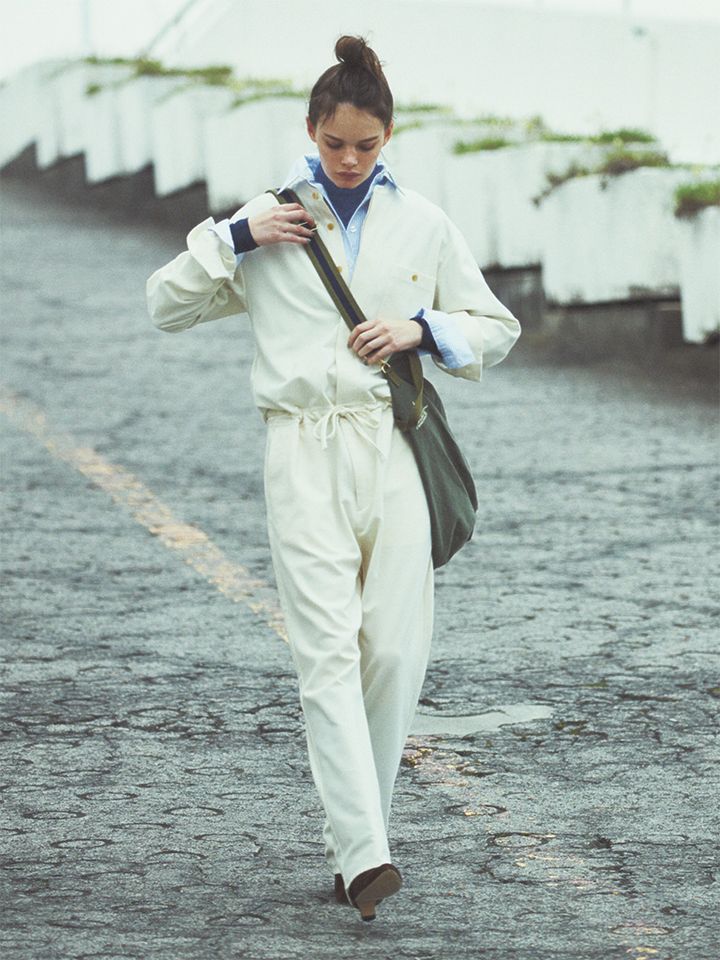 肩ひじ張らずに着られる、適度なゆとりのオールインワン。オフホワイトのワークシャツ・トラウザーをベースにしたデザインで、ゆるいシルエットでもスマートに着られる。起毛加工をほどこしたポリエステル素材で、いまに必要なぬくもり感とストレスのない着心地を両得。