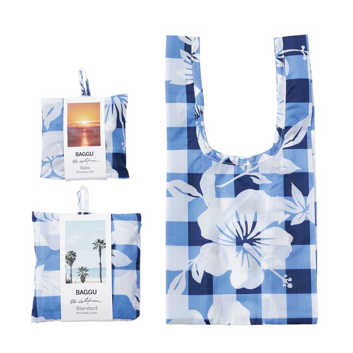 レジ袋を原型にナイロン製バッグをデザインした、カリフォルニア発のBAGGU。毎シーズン完売続出のロンハーマンコラボの最新作は、チェック×ハイビスカス柄。【右】ミニ¥2,640【左上】ベイビー¥3,190【左下】スタンダード¥3,850(ロンハーマン)
