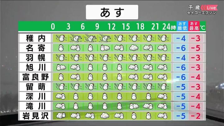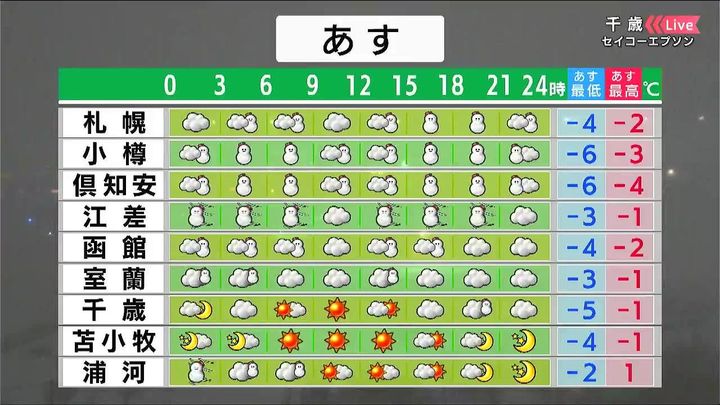 今夜は雪の強まる時間がありますが、あす8日(木)の千歳は晴れ間がある見込みです。