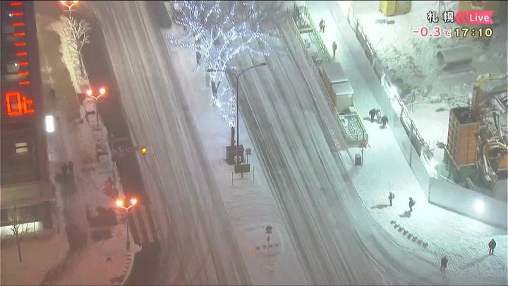 札幌の駅前通りの車道は白くなっています。この2~3時間で5センチくらいの雪が降りました。
