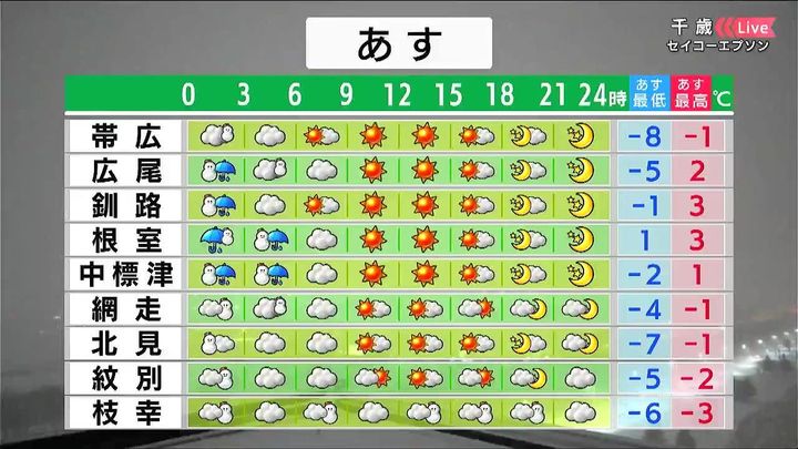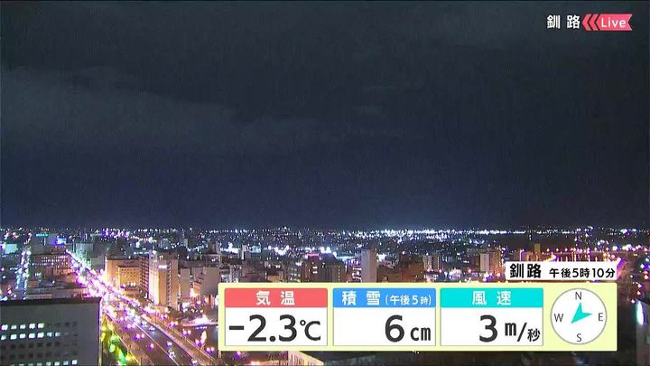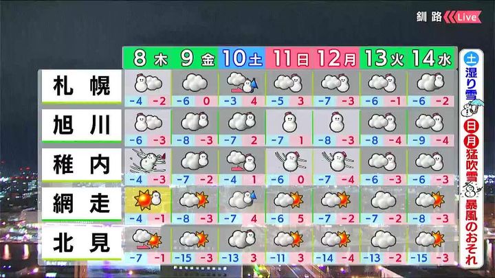 釧路は穏やかそうですが、今夜9時以降、ミゾレが降りそうです。ミゾレということで、気温は高め。あす8日(木)朝の最低気温-1度は、けさより13度も高くなります。この先も気温変化が大きくなります。