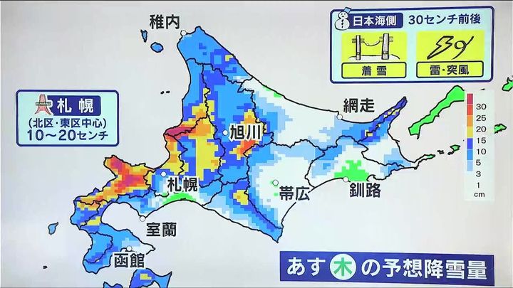 札幌の北区、東区や空知地方も20センチ近い雪が降りそうです。大雪による交通障害や湿った雪による電線への着雪、落雷や突風にも注意して下さい。