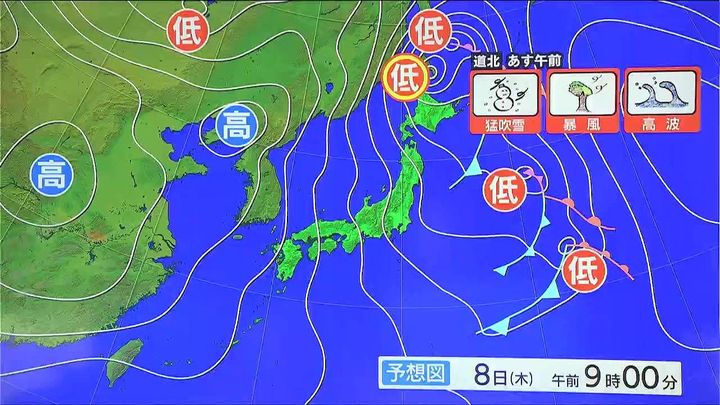 これから全道的に湿った雪が降ります。雪の原因は低気圧です。あす8日(木)朝9時の予想天気図です。日本海から近づく低気圧が北海道の北で発達します。低気圧に近い道北では、あす午前は猛吹雪や吹きだまりによる交通障害、暴風、高波に警戒が必要です。