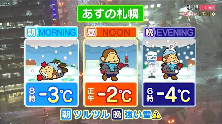朝と夕方を中心に雪が強まるでしょう。後志地方は局地的な大雪にも注意して下さい。千歳や苫小牧は晴れますが、今夜にかけて降る湿った雪が朝はツルツルに凍りそうです。