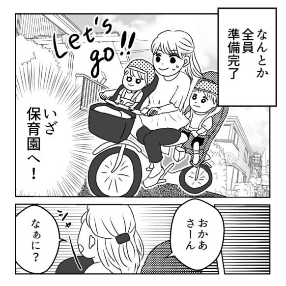 ワーママの朝は毎日戦い。子どもの世話をしながら自分の支度を進めるため、毎朝バタバタで時間がないママも多いのではないでしょうか。なんとか子どもたちの支度を終わらせて、やっとの思いで自転車に乗せたと思ったら、なんと息子が衝撃発言!いったいママは無事に子どもたちを送り届けられるのか!?