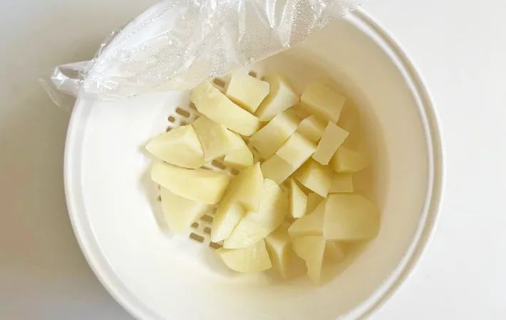 耐熱容器に切ったジャガイモを入れ、ふんわりとラップをかけ、600Wの電子レンジで4~5分ほど加熱してください。