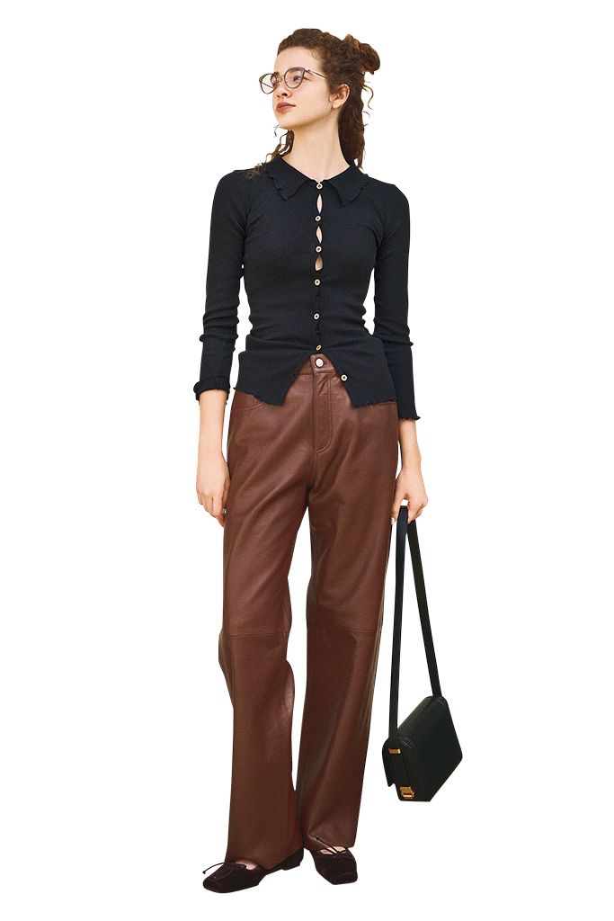 黒カーディガン/BASERANGE(エディット フォー ルル) 茶レザーパンツ/HAIKURE(ショールーム ロイト) 眼鏡/プロポ(プロポデザイン) バッグ/スーザン サツマリー(ユナイテッドアローズ 渋谷スクランブルスクエア店) シューズ/TSURU By MARIKO OIKAWA インナー/スタイリスト私物