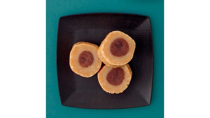 江戸時代に東寺の僧侶から注文を受けて誕生。昔は非売品でしたが、評判が広まり一般向けにも販売されるように。「弘法大師の月命日に合わせ、毎月3日間のみ発売される幻のロール状のどら焼きです」と小山さん。何層にも巻かれた生地が特徴的。