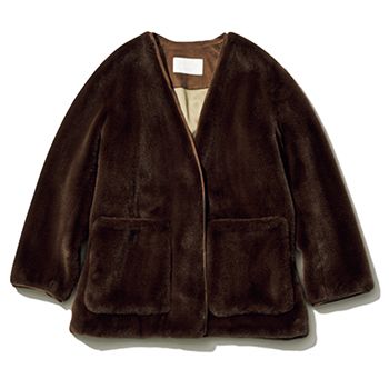 装飾を削ぎ落としたノーカラーが、素材そのもののリッチさを際立たせる。ほのかにツヤを感じるしっとりとしたブラウンのファーは、デニムなどのカジュアルなボトムと合わせても品よくまとまる。カーディガンのように気軽に羽織れる軽やかさも魅力。