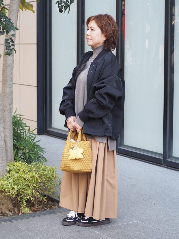 グレーのニットとベージュのスカート、ニュアンスカラーでまとめたスタイリングを引き締める「ガリャルダガランテ」のブルゾンがこの冬の定番。「ほどよいボリューム袖で、ニットの上に重ねてもゴワつきがきにならないのがうれしいです」。挿し色のイエローのバッグで、装いを明るく軽やかに。
