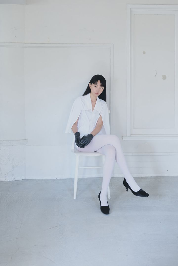 さらにキーとなるのは、テーラードシャツをベースにケープのようなシルエットへ再構築したトップス。