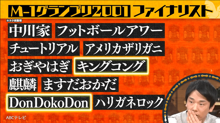 その第1回大会のファイナリストが紹介され、礼二が「この中でもDonDokoDonのぐっさんだけ飛び抜けて売れててん」と話すと、濱家は「キングコングさんとかDonDokoDonさんぐらいですよね。全国でめちゃくちゃ出てはったのは」と補足。中川家は「キングコングとハリガネロックはネタ合わせばっかりしてた。もうどんだけすんねんいうぐらい」とM-1決勝当日を振り返った。