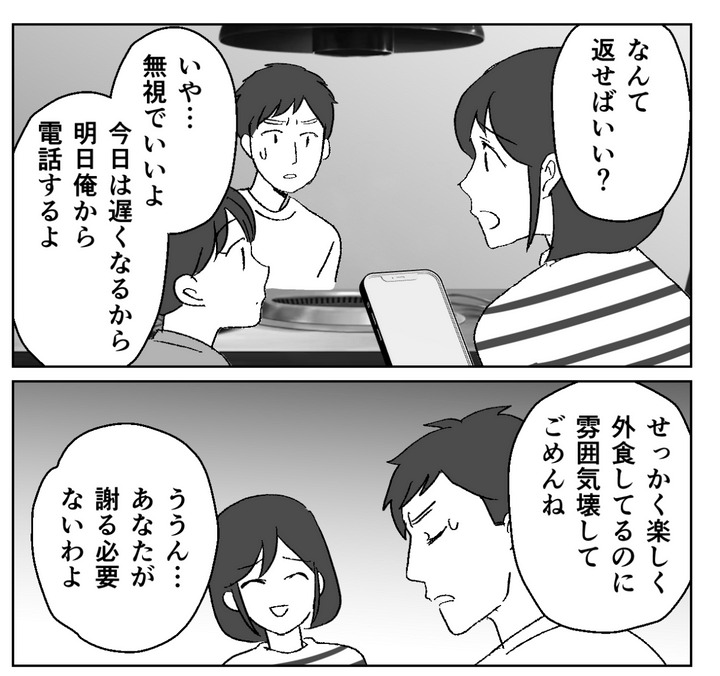 なんて返せばいいか夫に相談したところ、「無視でいい、明日俺から電話する」と言ってくれたので、少しホッとしました。とりあえず引き続き食事を楽しもうと思ったのですが……そんなに悪いことをしてしまったのか、どうにもモヤモヤが残ります。