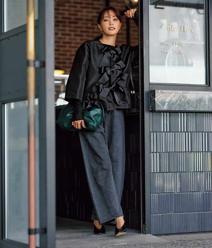 クールな黒だからこそ少し大袈裟すぎるビッグリボンも小花柄の可憐さも難しくない。黒が甘さを包み込み、装いを大人モードへ。強さと包容力を併せ持つこの色なら女子会ランチでも品よく華やぎ、肩肘張らないオシャレが楽しめます。