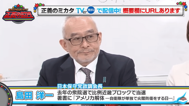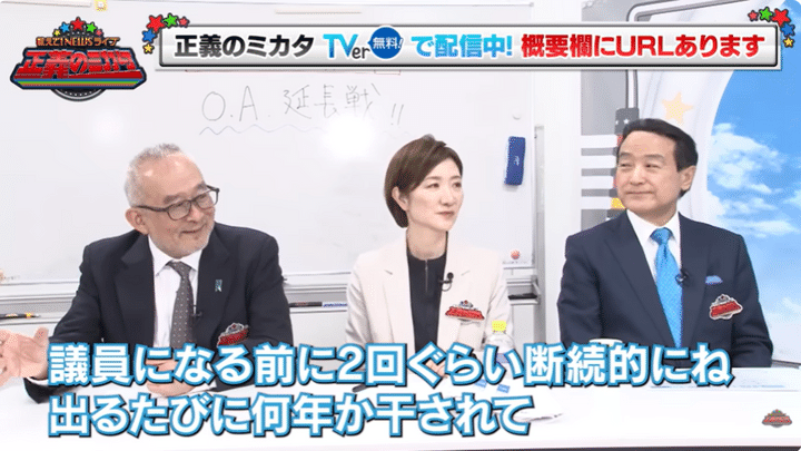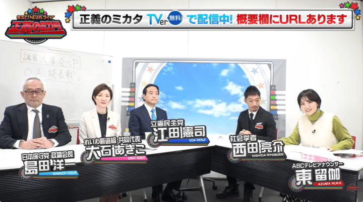 立憲民主党の元代表代行・江田憲司氏と、れいわ新選組共同代表の大石あきこ氏は12月20日の生放送が「正義のミカタ」初出演だ。一方、日本保守党で政調会長を務める島田洋一氏は議員になる前に2回ほど出演していたというが「出るたびに何年か干されて」と開始早々ぶっちゃけた。