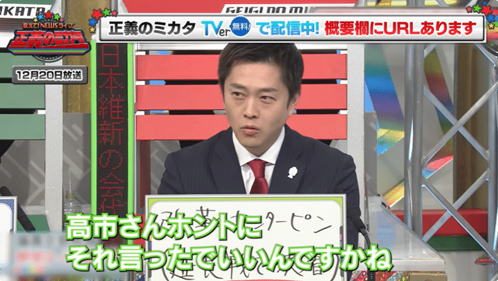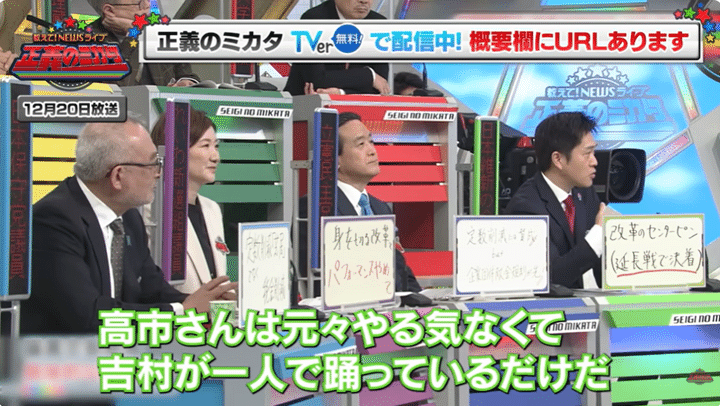 12月10日の「正義のミカタ」生出演後には、吉村氏に対して「吉村さん、もったいないよ」と伝え、「来年定数削減法案を審議するためなんだったら、この公明・公民案に吉村さんが一声乗ると言ったらもう成立するから。そうすると我々も定数削減法案に行きますよ」と声をかけたことを明かした。