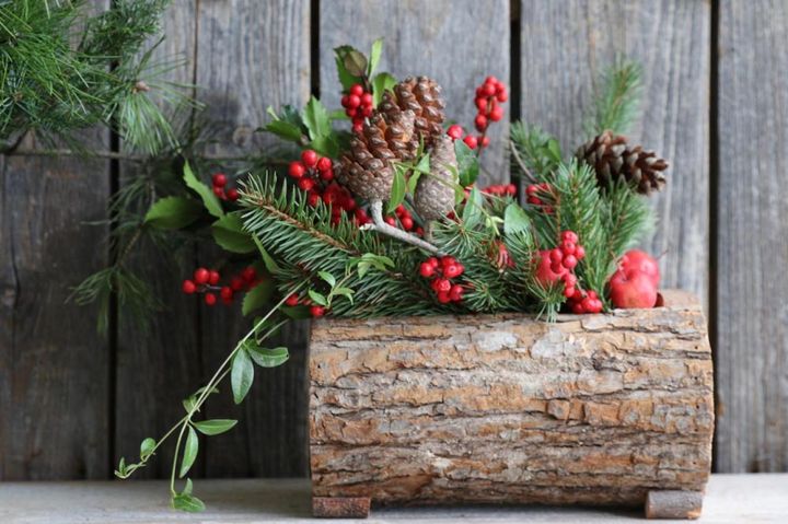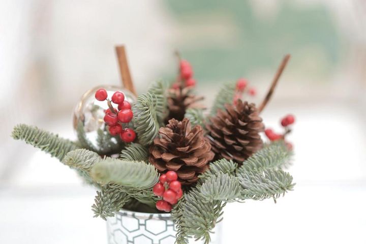 また、マツなどの針葉樹はグリーンからブルーグレーの葉色にすると、雰囲気ががらりと変わります。コップのような器にマツボックリやシナモンスティックなどと活けると、ポップな雰囲気です。寒い時期なのでさまざまな葉色のコニファーや赤い実の切り枝を組み合わせ、窓辺でアレンジメントを楽しむこともできます。