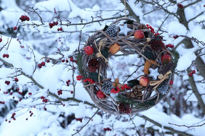 フジやアケビのつるをつかったリースには、針葉樹の切り枝は少しにしてミニリンゴやサンキライなどの赤い実とマツボックリやドングリなどをつけると、実りの楽しさあふれるリースができます。雪の降る寒い日には、深さのある皿にボールをかぶせて水を入れ、赤い実を凍らせるアイスリースも楽しめます。