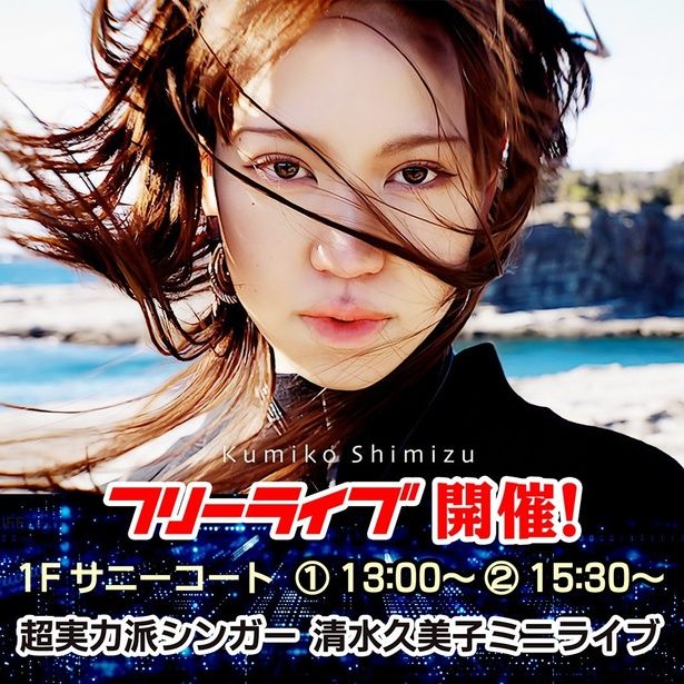「関西で注目の超実力派シンガー」として多数のテレビ番組で特集されている話題の音楽アーティスト、清水久美子さんのフリーライブ。全国40局以上のラジオ局でオンエア・パワープレイ楽曲に選ばれたオリジナル楽曲や、最新曲「Silent Flame」などを演奏予定。特設ステージで素晴らしい歌声を披露したあとサイン会が開催される。