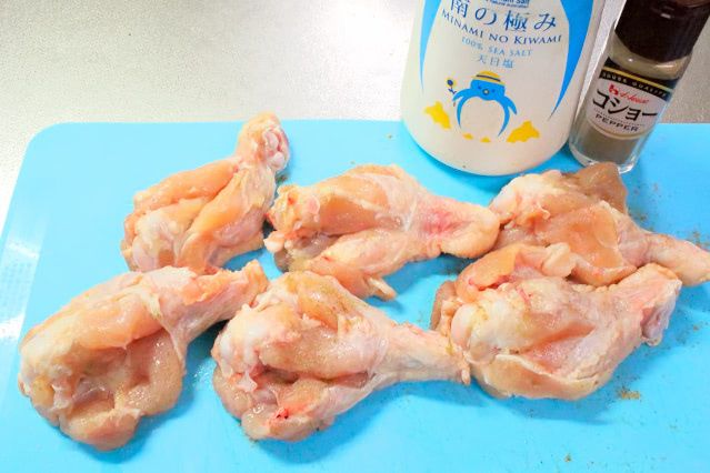 1. 手羽元の裏側から骨に沿って切り込みを入れ、塩(小さじ1/3)とこしょうをすり込みます。
