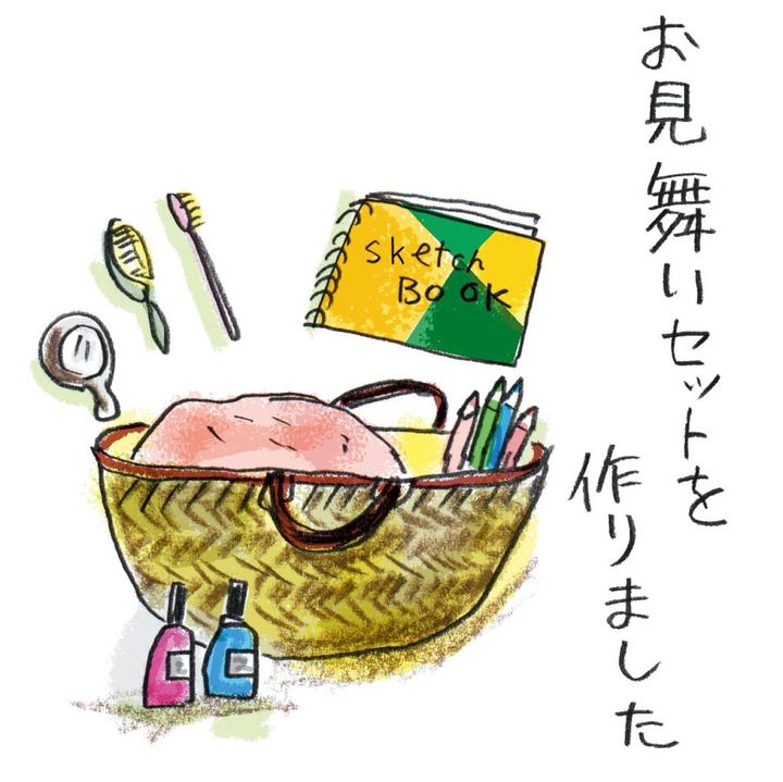 ピンクの歯ブラシとタオル、スケッチブックとペンと色鉛筆。退院後のお楽しみ用のマニキュアなどね。