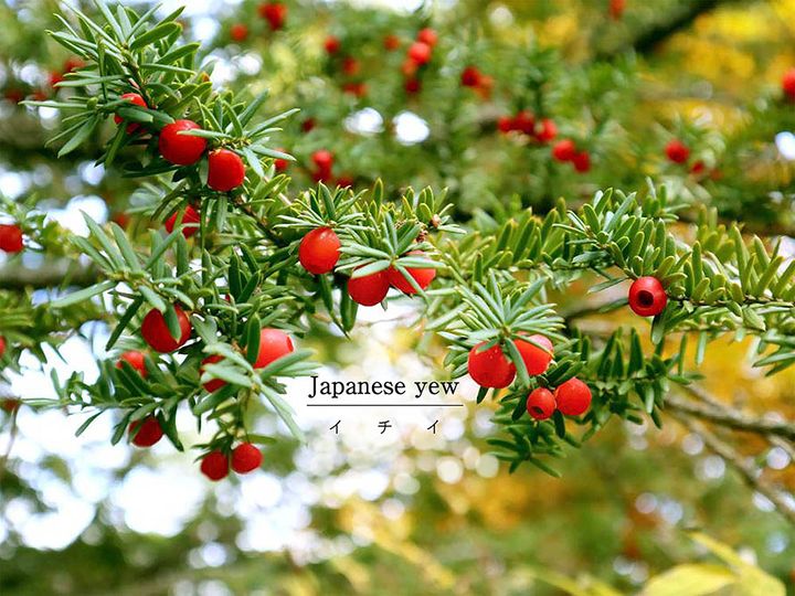 イチイの花言葉は、「高尚」「悲哀」「残念」「慰め」など。「高尚」は貴族が持つ笏にまつわるためで、「悲哀」「残念」「慰め」は、西洋では墓地に植栽されてきたことに由来しています。