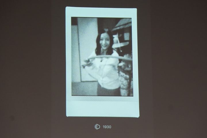 同アイテムでの動画撮影の魅力の一つは、様々な時代をイメージしたエフェクトを体験できる「ジダイヤル」。 最初にカメラを持った横浜さんは、モノクロフィルムカメラの風合いが楽しめる「1930年代」をチョイス。セットの中から昭和レトロな小道具を2人でセレクトしながら撮影していました。