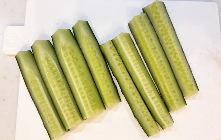 鶏むね肉を加熱している間に、キュウリを切っておきましょう。