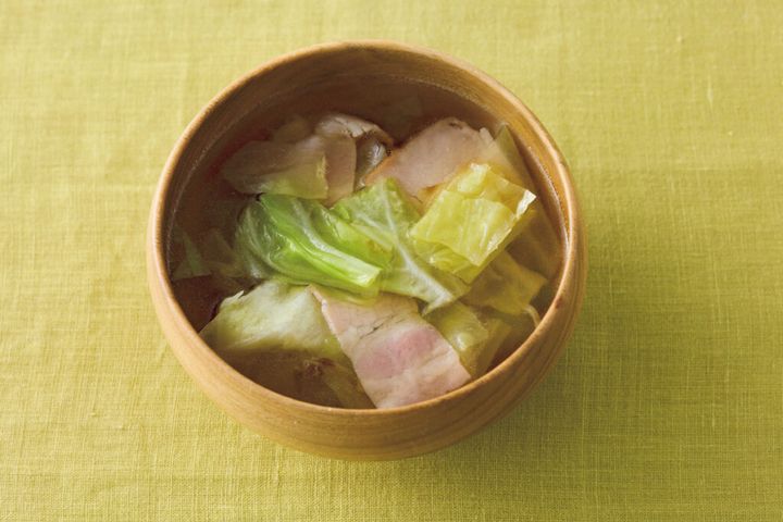 (2)鍋にサラダ油小さじ2を中火で熱し、キャベツを2~3分炒める。ベーコン、だし汁、塩小さじ1/4、しょうゆ、酒各小さじ1を加え、2~3分煮て塩少々で味をととのえる。