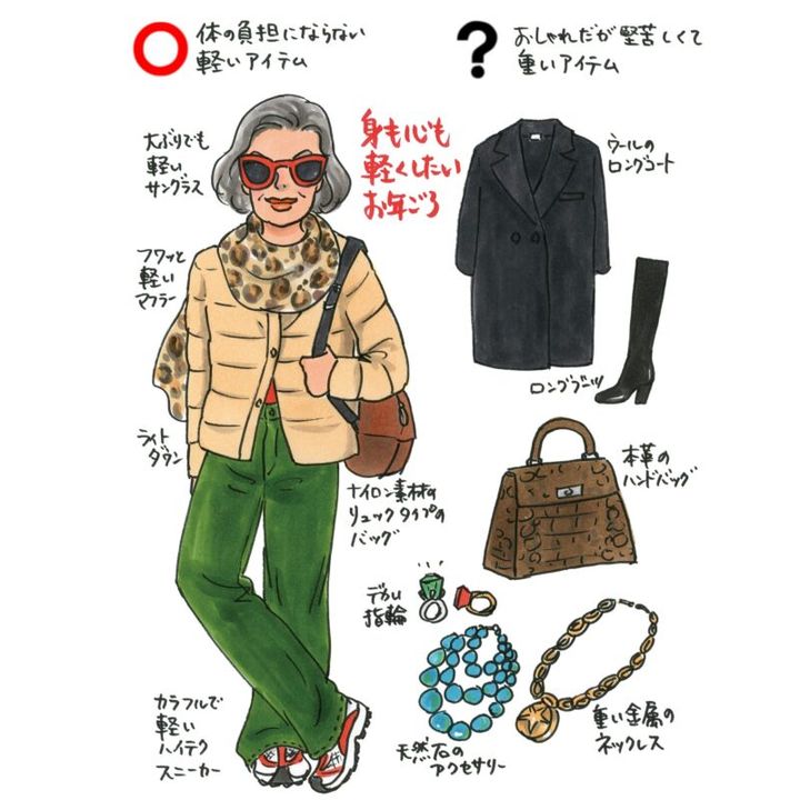 体力の衰えのせいか、〝おしゃれはガマン〟の精神が薄れたせいか、最近ではとにかく重いファッションアイテムを身につけるのが苦痛になってきた。ウールのロングコート、革のジャケット、大きな本革のバッグ。アクセサリーも天然石や金属の重いものは疲れるので極力したくない。相変わらず大ぶりなアクセサリーは大好きなのだが、軽い樹脂のものを選ぶようになった。