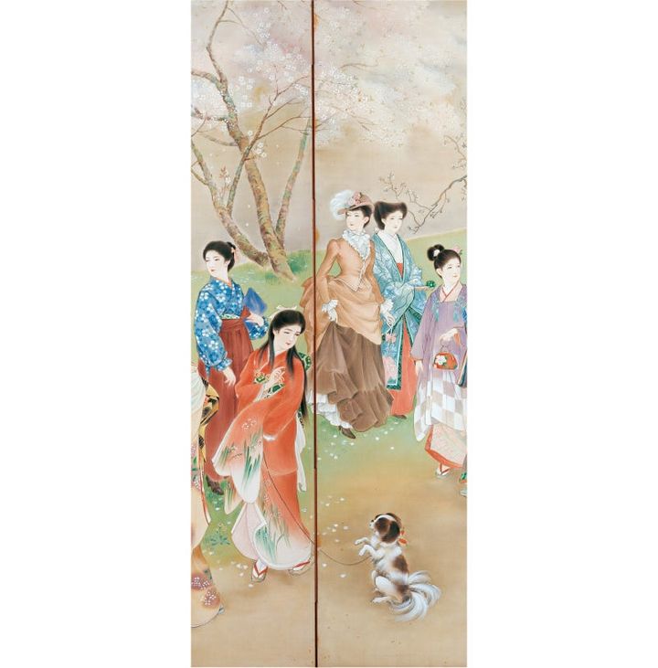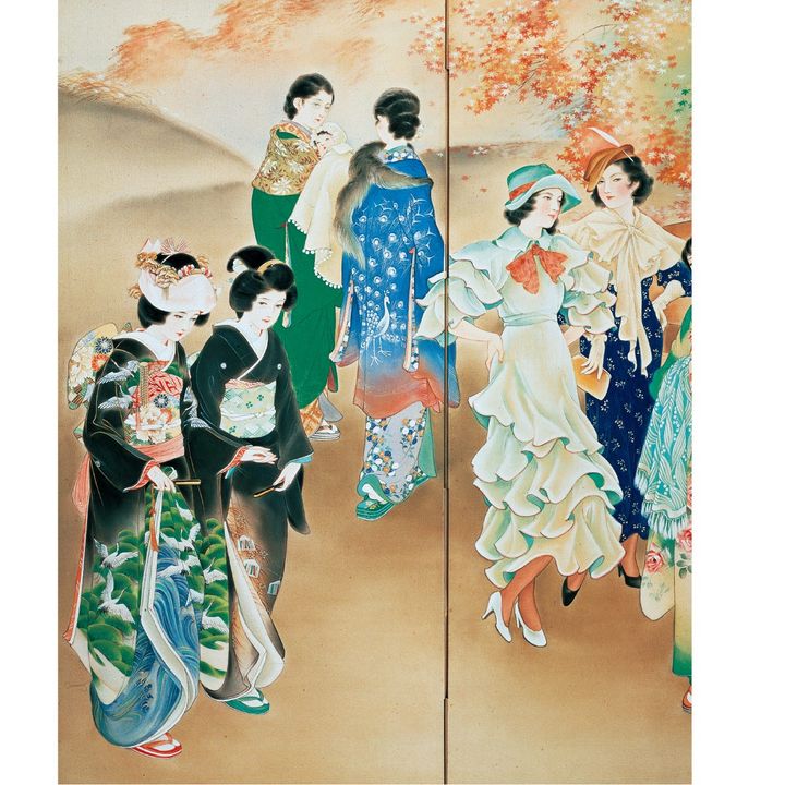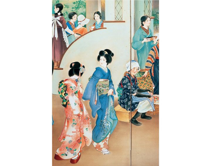 一世を風靡した画家、高畠華宵(たかばたけかしょう)の大作「移りゆく姿」に描かれた60人余の時代背景と装いを、着物研究家・山下悦子さんの解説でお届けします。