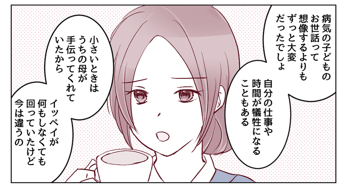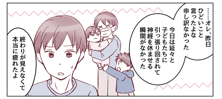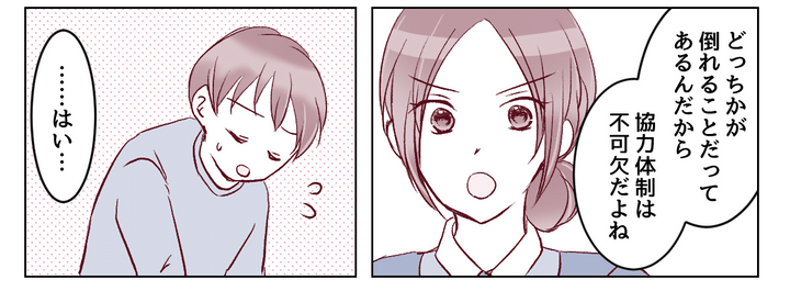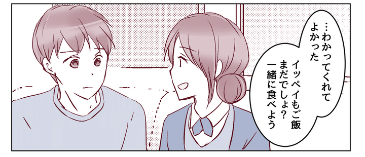 イッペイは私の大変さをようやく理解してくれたようです。私も今日一日頑張ってくれたであろうイッペイを素直にねぎらいました。そして夫婦で夕飯を食べながら、私は今後の協力体制についてしっかり話し合うことにしました。