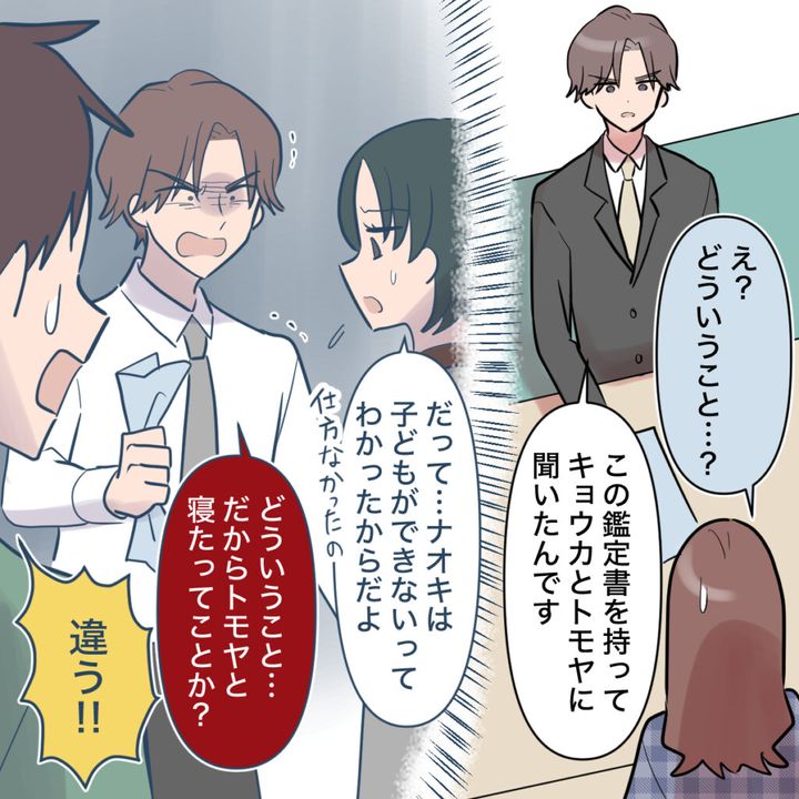 「だって・・ナオキは子どもができないってわかったからだよ。仕方なかったの」ナオキさんの言葉に言い訳するキョウカさん。「どういうこと・・だからトモヤと寝たってことか?」震えながら問い詰めると、「違う!!」とトモヤが割って入ったと言うのでした。