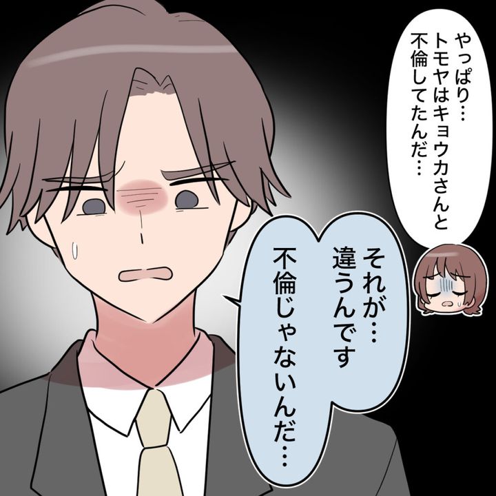 ナオキさんの言葉を聞いて絶望する私は「やっぱり・・トモヤはキョウカさんと不倫してたんだ・・」と呟くと、「それが・・違うんです。不倫じゃないんだ・・」と複雑な表情をするナオキさん。