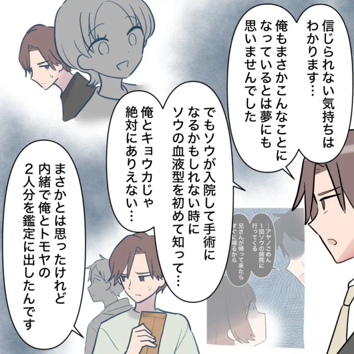 唖然としている私に、「信じられない気持ちはわかります・・俺もまさかこんなことになっているとは夢にも思いませんでした。でも、ソウが入院して手術になるかもしれない時に、ソウの血液型を初めて知って・・俺とキョウカじゃ絶対にありえない・・。まさかとは思ったけれど、内緒で俺とトモヤの2人分を鑑定に出したんです」ナオキさんが事情を説明してくれました。