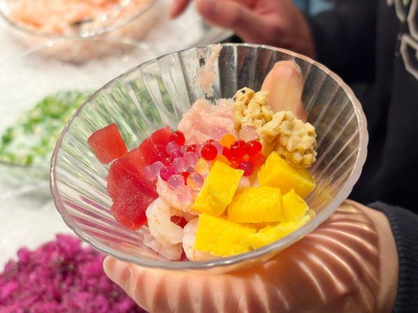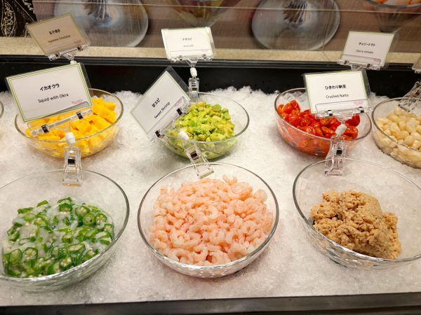 見た目も美しい「リラッサ海鮮パフェ」は、鮪・鮭・甘えび・いかオクラなど10種類を超える食材を自分で好きなように組み合わせてオリジナルの海鮮パフェを作るワクワクが止まらないメニュー!