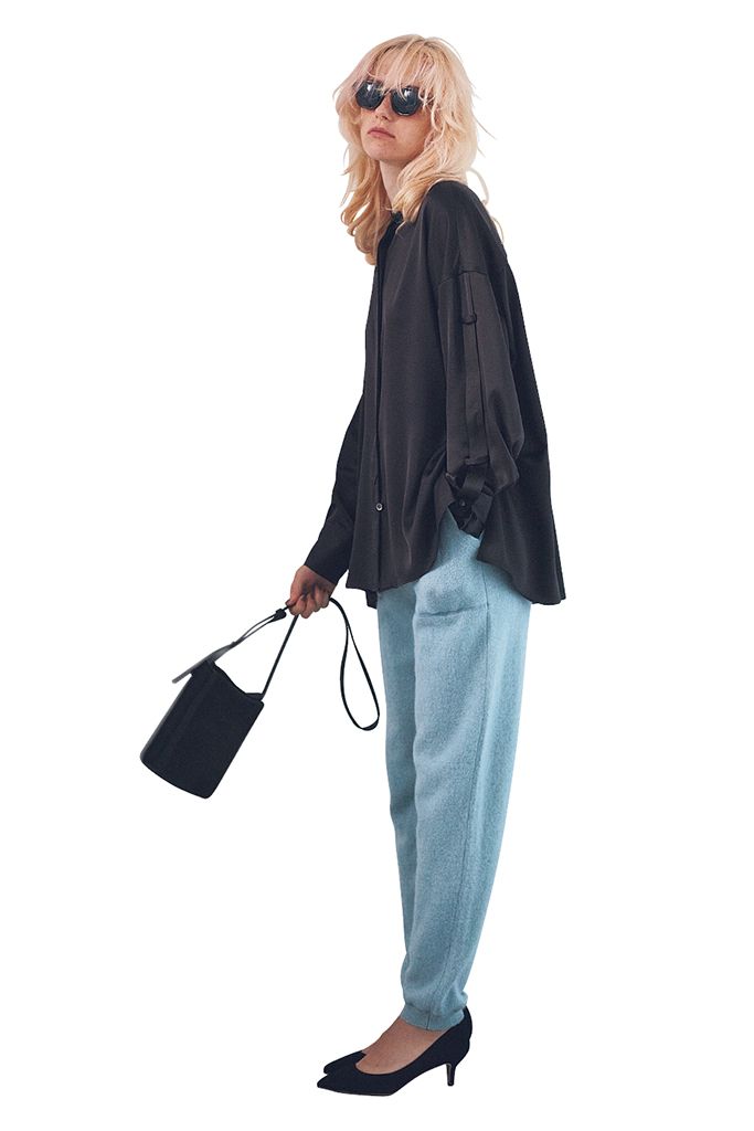 ニットパンツのフォギーな質感で、にごりのないブルーを秋冬仕様に。対してブラウンは色にぬくもりがあるぶん、シルク見えするリュクスな光沢でほっこり感を微調整。