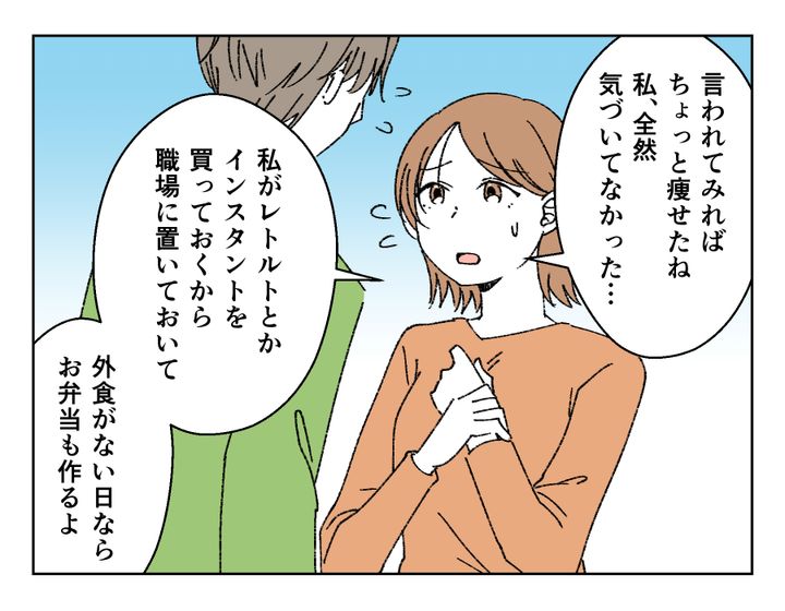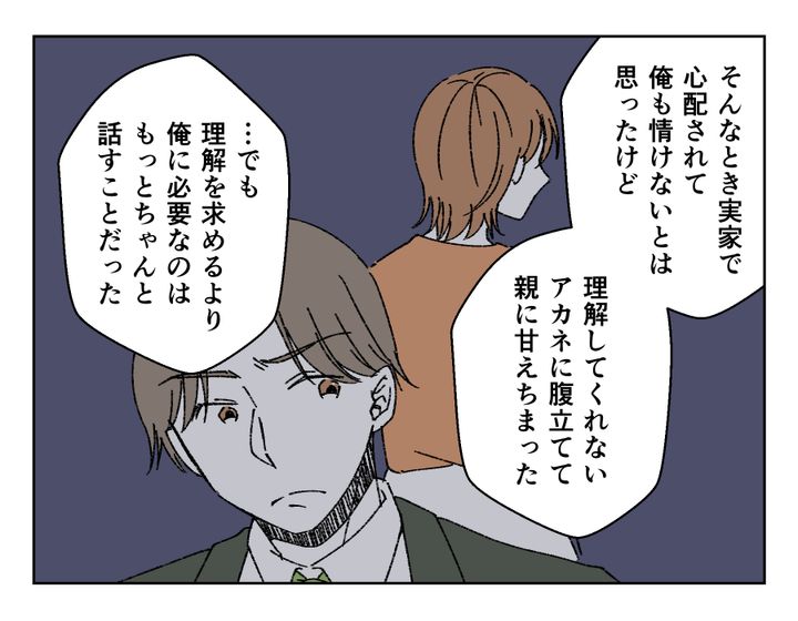 ユウノスケさん、とくに苦しかった先月と今月の話を始めました。アカネさんは出産を機にずっと専業主婦。話を聞きながら、自分の社会人時代のツラさを思い出していました。もちろん今も専業主婦として大変ですが、出費せざるを得ないお付き合いや、営業の失敗で心が折れることからは遠ざかっています。それなのに「ズルい」は言いすぎだったと、苦しそうに話すユウノスケさんを見ながらより反省したようです。そしてアカネさんが具体的な改善案を話し、ユウノスケさんが「やめる」と宣言したことで、2人の心の距離はぐっと縮まりました。