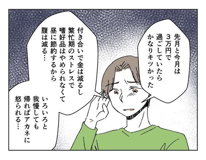 アカネさん(30)は夫・ユウノスケさん(30)と年少の娘さんの3人暮らしの専業主婦。そんなアカネさんにはとある不満が。それはユウノスケさんが家計からのお小遣い3万円に加えて、お義母さんから毎月追加で2万円のお金をもらっていること。それが原因で喧嘩となり、アカネさんは実家でお母さんに愚痴をこぼします。注意してもやめず、それがビールやタバコのお金になっていることに怒るアカネさんでしたが、ユウノスケさんのお昼事情を聞いてお母さんの態度が一転。アカネさんが説教される側となり、反省したアカネさんはユウノスケさんに謝罪をしました。