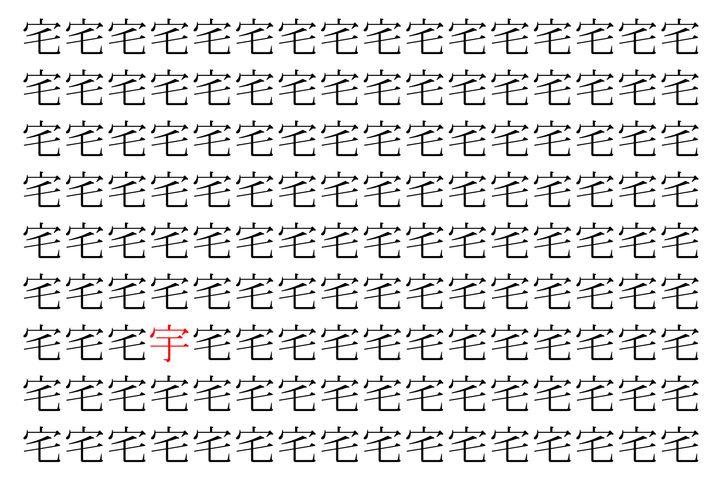 画像の中には、「宅」という漢字が縦に9行、横に16個並んでいます。 全部で144個となりますが・・・、そのうち1つは「異なる漢字」となってますよ!!