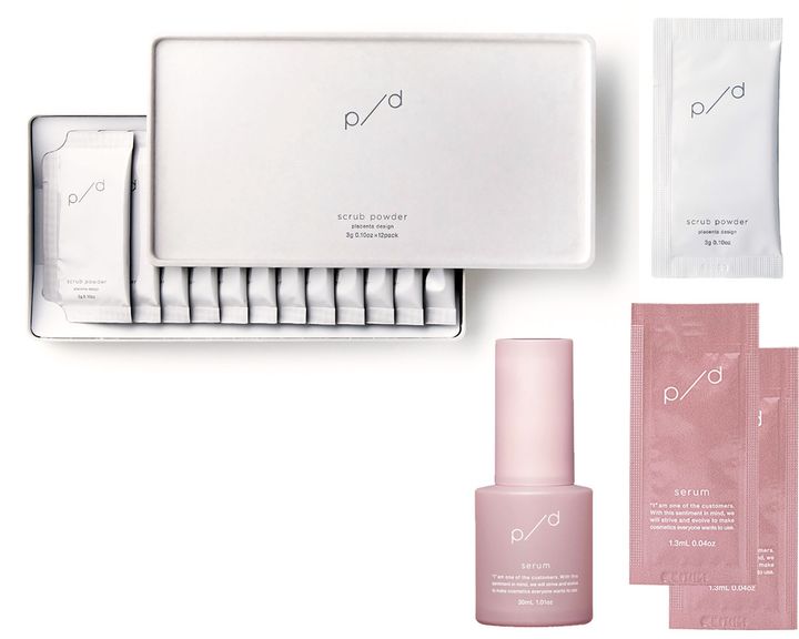 国産プラセンタ贅沢配合でしっとりハリ肌へ。p/d スクラブパウダー 3g パウチ1包、p/d 美容液 1.3ml×パウチ2包