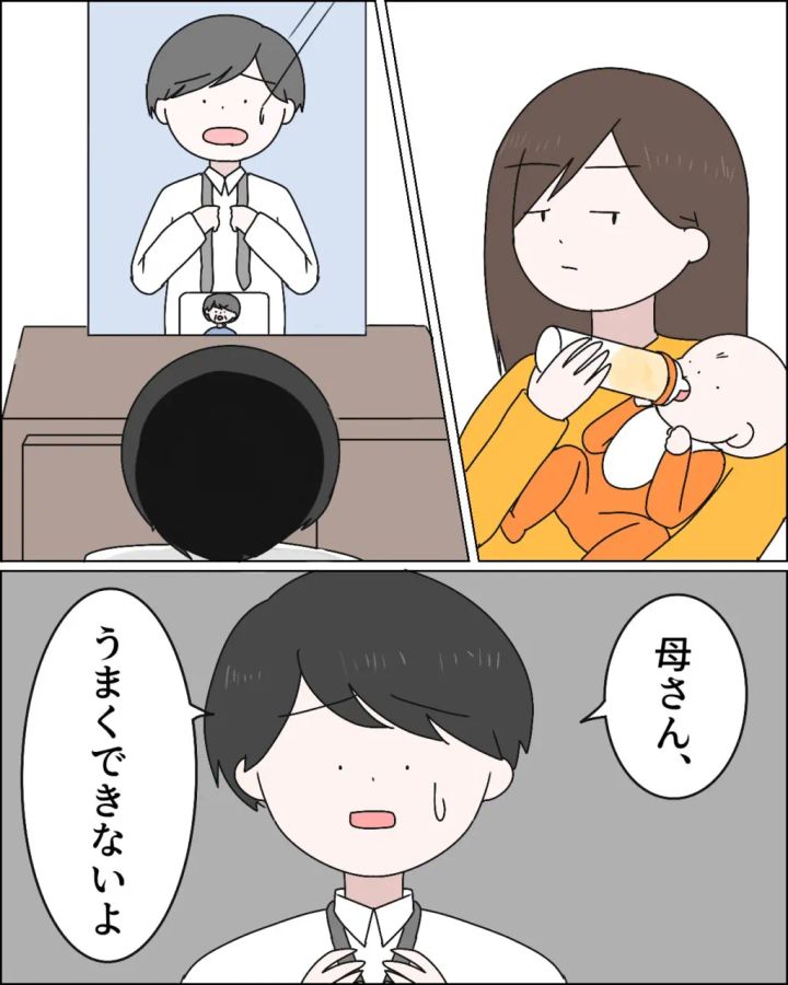 「母さん、ネクタイが・・・今日は大事な会議だから万全の体制で行きたいんだけど」マサオが困ったように言うと、義母は胸をドンと叩いて「マー君大丈夫よ、ビデオ通話にして!お母さんが教えてあげるから」と自信たっぷりに言いました。