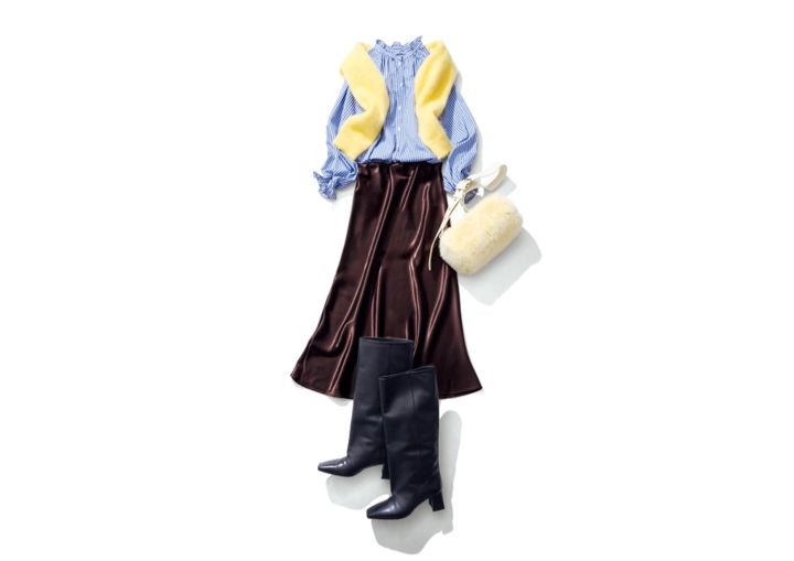 フリルネックブラウス¥2,290/GU 2WAYニット¥26,400/マイストラーダ サテンスカート¥5,000/Olu. ファーバッグ¥7,900/Olu. ロングブーツ¥79,200/ファビオ ルスコーニ(エリオポール代官山)