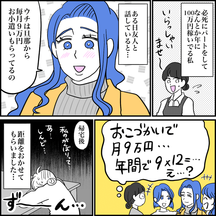いいですね、毎月自由に使っていい9万円がある人生。なんともうらやましい話です。かたや自分は、身を粉にして働いて年間やっと100万円。私の頑張りって……なに?